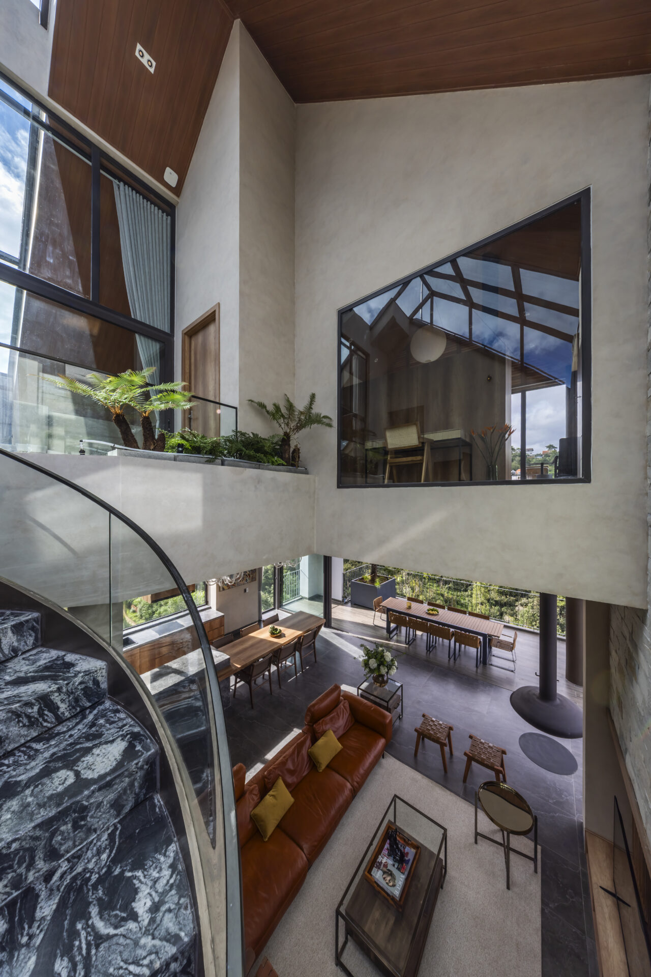 Phòng khách và bếp mở hiện đại, đón ánh sáng tự nhiên len qua từng đường nét, tạo nên cảm giác sang trọng nhưng vẫn thân thuộc, như một ngôi nhà đẹp đẽ bạn vô tình tìm thấy giữa lòng Đà Lạt.
